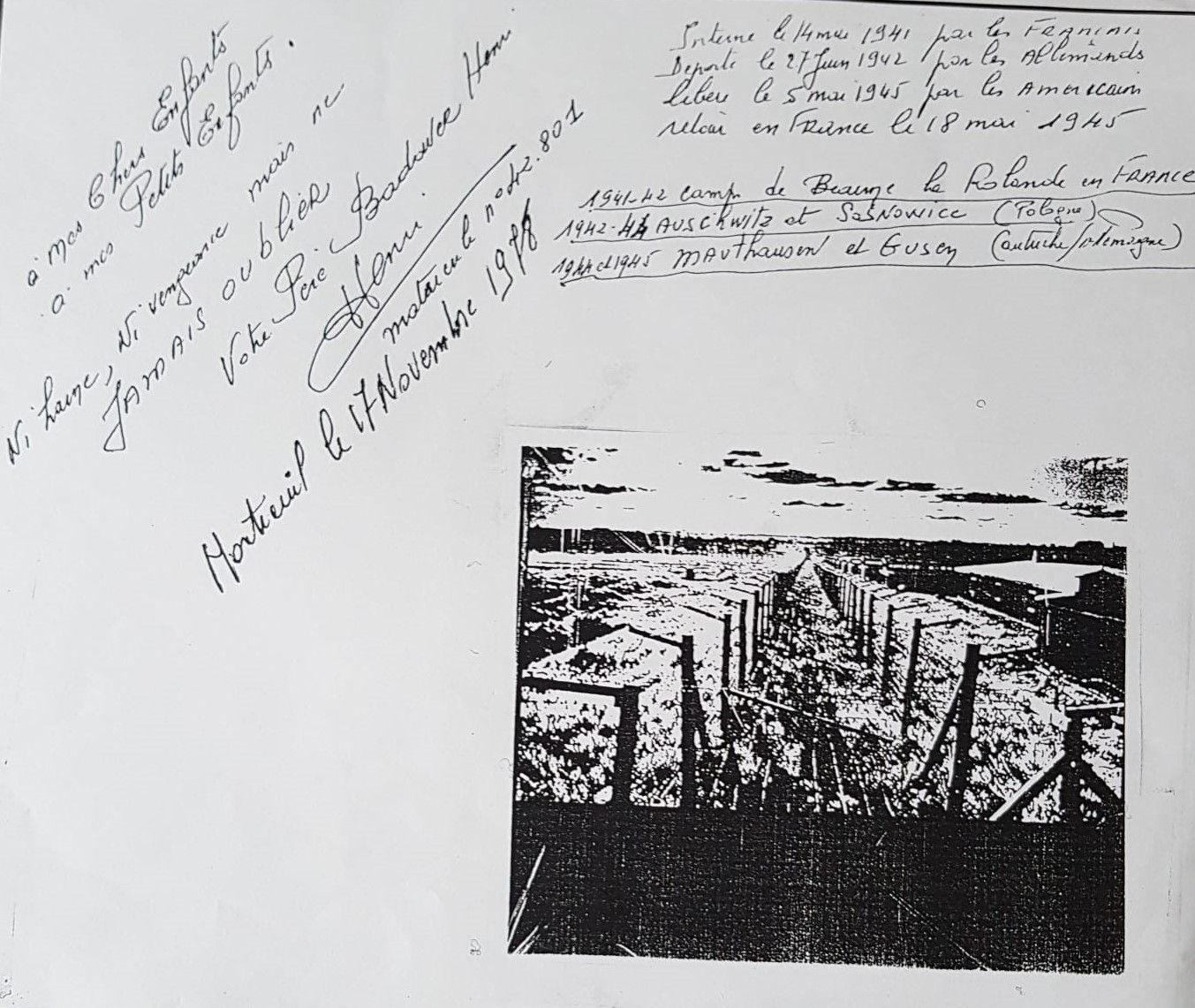 Henri Badower et son beau-père "Schmile" furent arrêtés le 14 mai 1941, avec plus de 3 700 Juifs étrangers, par la police française, et transférés à Beaune la Rolande ; le texte décrit et illustre ce que furent les conditions d'internement dans un des 200 camps ayant existé en territoire français, jusqu'à ce que Henri et ses camarades soient dispersés ou déportés, ce sera le 28 juin 1942, dans un convoi de 1038 hommes et femmes. L'univers concentrationnaire fait l'objet de 2 chapitres car Henri Badower (matricule 42801) survécut à 5 camps : Auschwitz I, II (Birkenau), III (Buna-Monowitz) puis Sosnowitz (à partir du 4 mai 1944) et enfin au terme d'une marche-train de la mort, Mauthausen-Gusen II.
