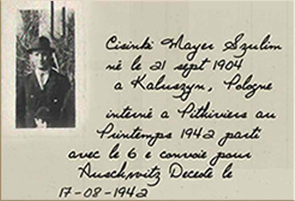 Mayer CISINSKI est né à Kaluszyn (Pologne) le 21 septembre 1904. Il était tricoteur et demeurait 45 Grande Rue à Avallon. Il était marié à Ita FINKELSZTEJN déportée avec lui par le convoi 6. Leur fils Emile a échappé à la déportation.