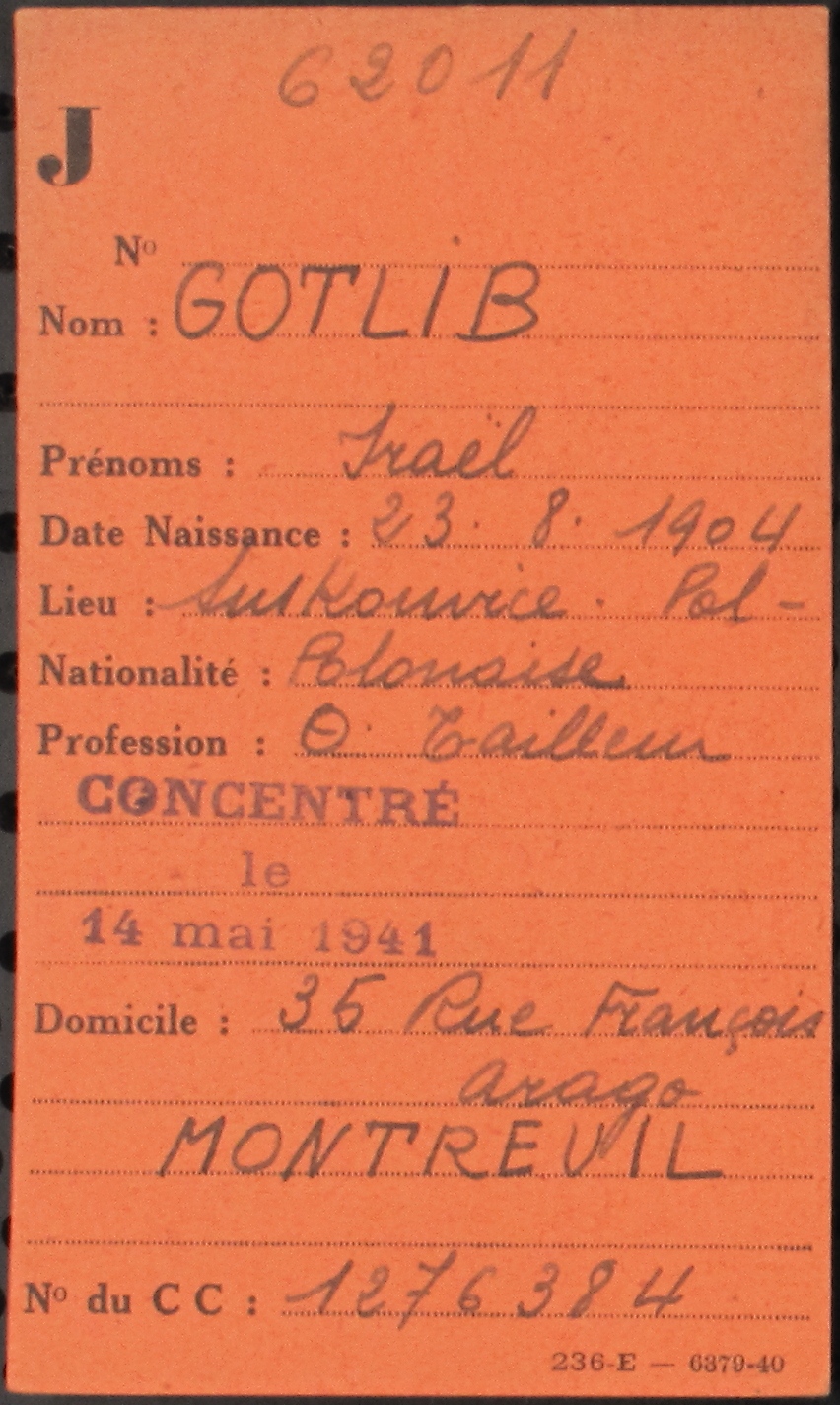 Israël GOTLIB est né à Sosnowice. Il était tailleur et demeurait à Montreuil, 35, rue François Arago. Il s'est engagé volontaire au début de la guerre. Convoqué par le Billet Vert, il a été arrêté le 14 mai 1941 et interné. Il était marié à Ruchla ZYLBERBERG. Ils avaient 3 filles. Ruchla a été déportée par le convoi 20 avec Paulette et Simone. Seule l'ainée Anna a échappé à la déportation.