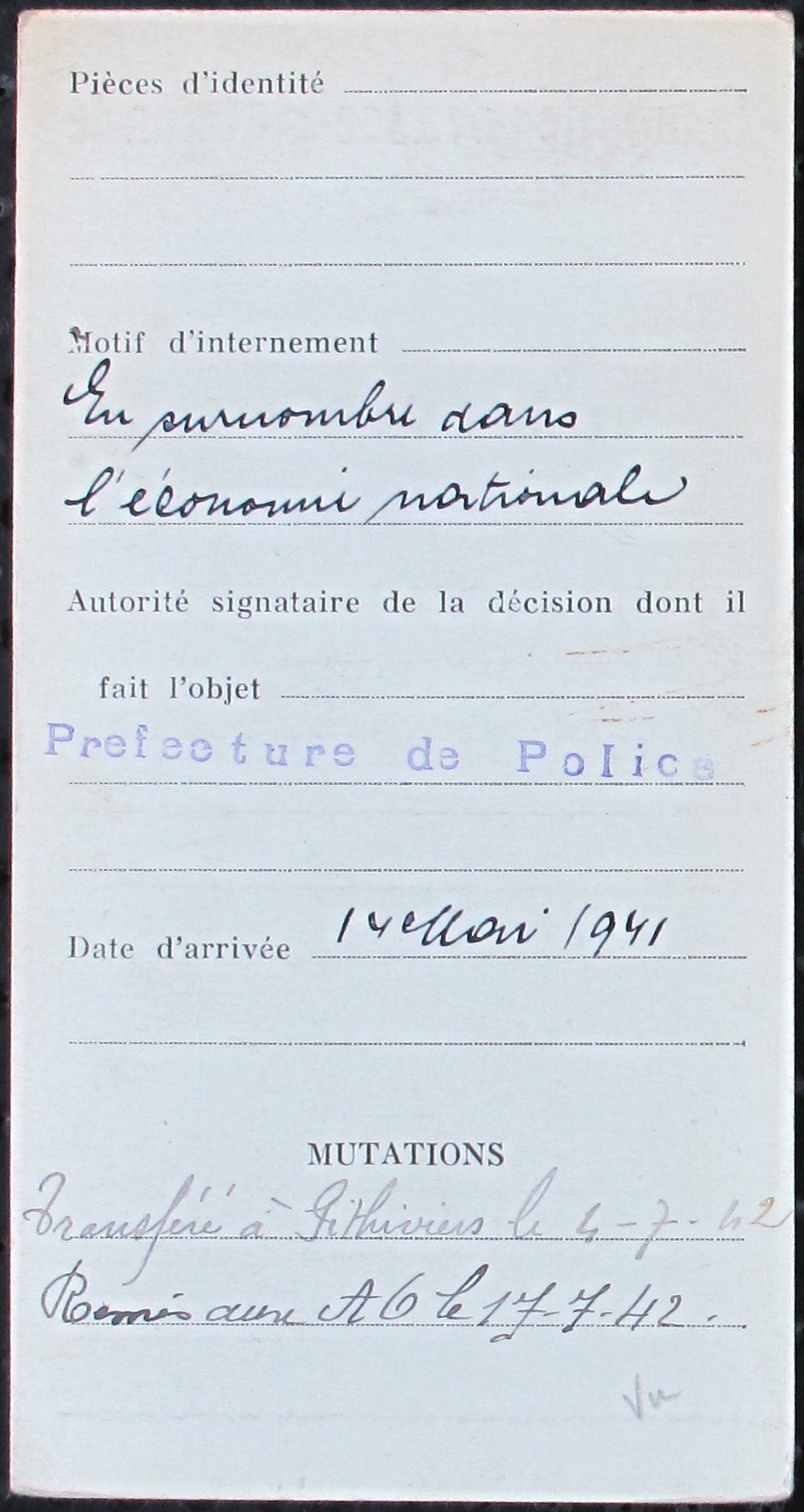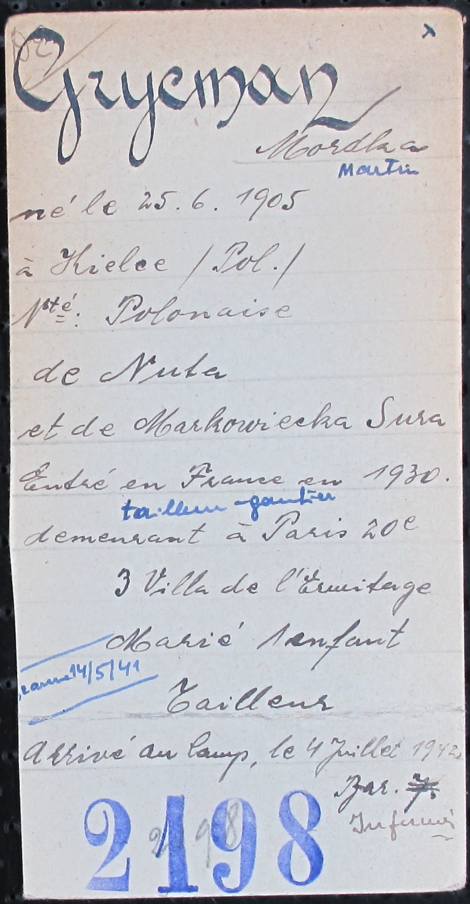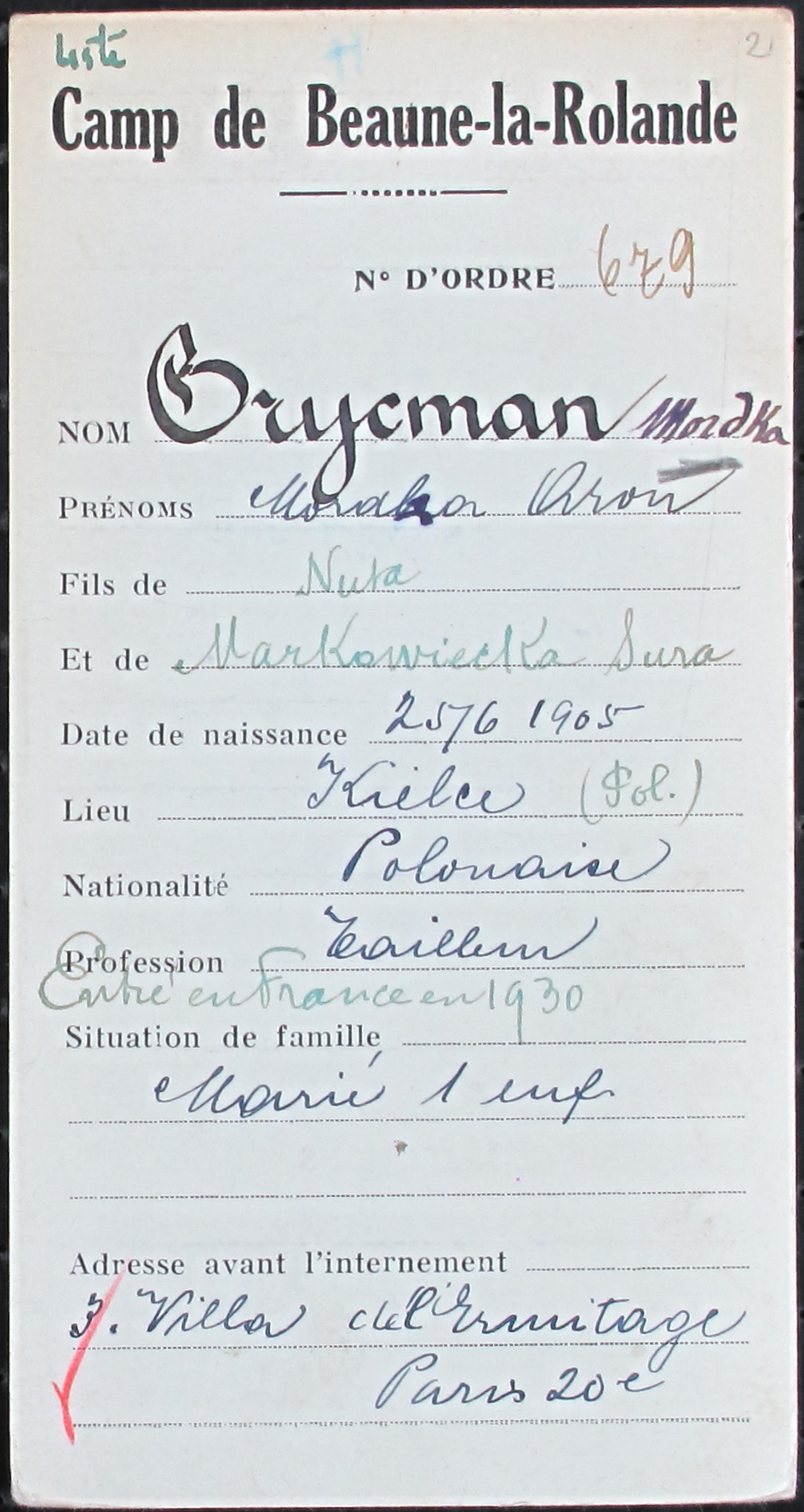 Mordka GRYCMAN est né en 1905 à Kielce (Pologne) et habitait Paris 20e. Il était gantier. Il était marié. Il avait un enfant. Arrêté suite à la convocation du Billet Vert, il a été interné dans le Loiret. Il a survécu à la déportation.