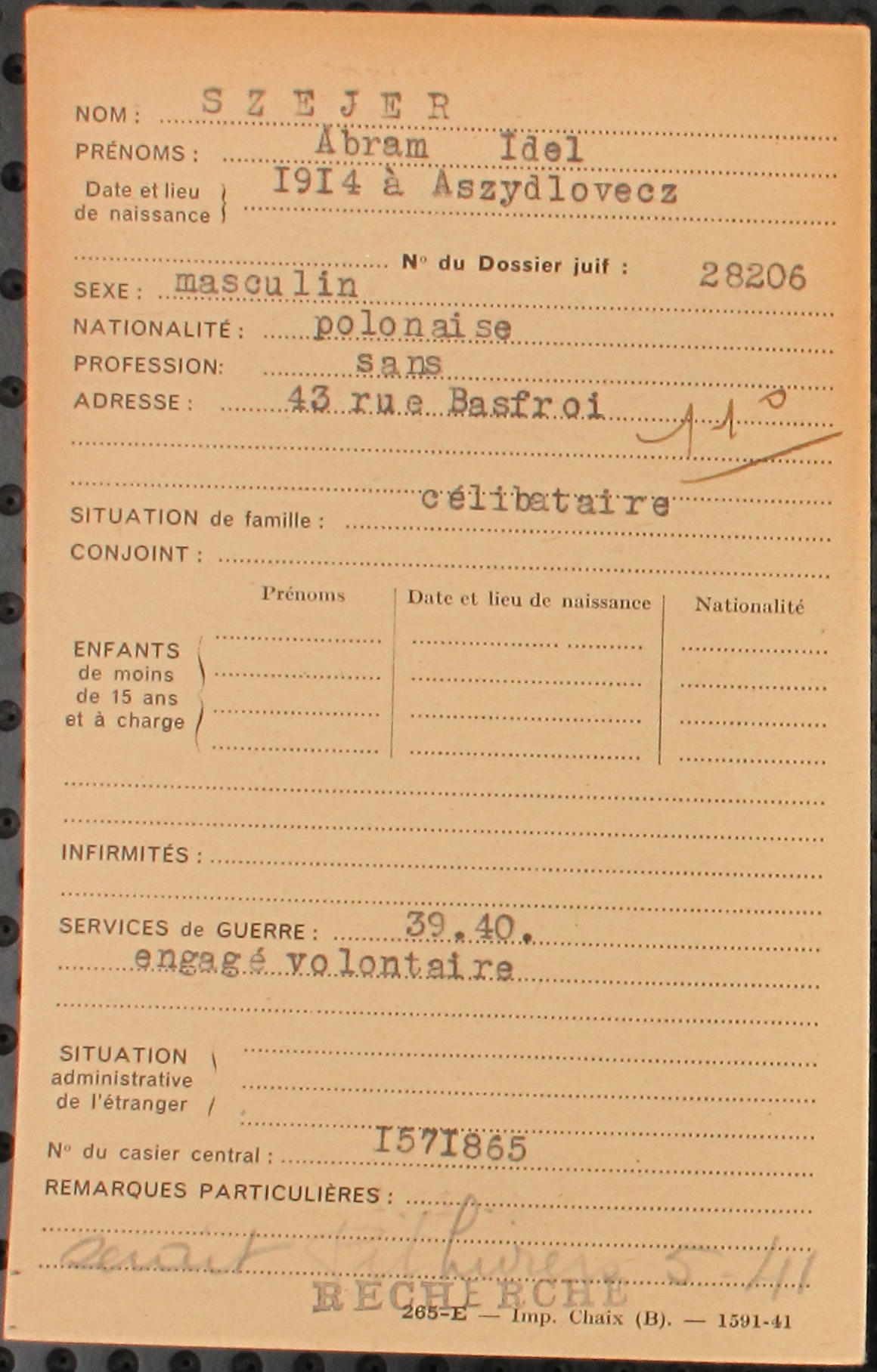 Abram SZEJER est né à Szydlowiec. Il demeurait à Paris 11e, 43, rue Basfroi. Il était célibataire.
